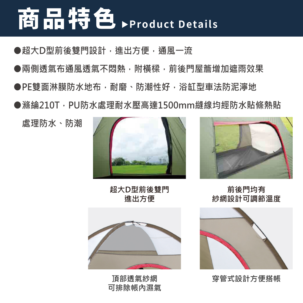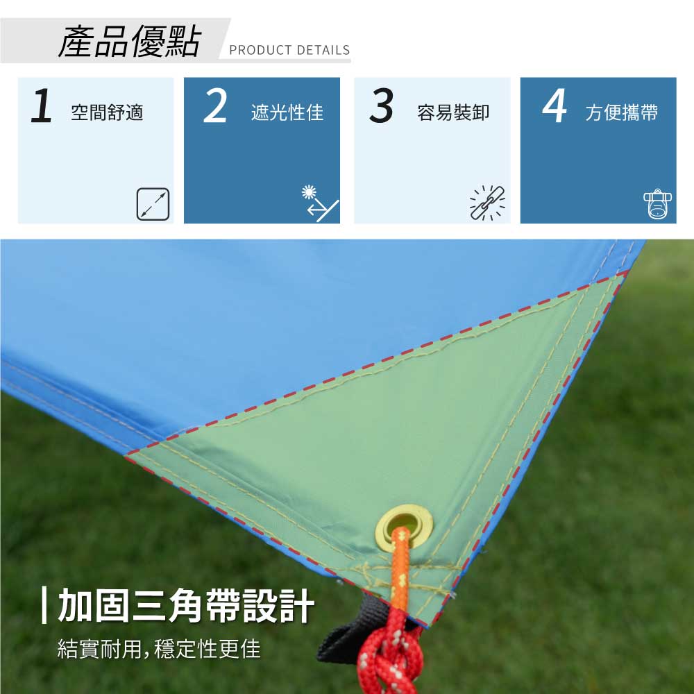 | 天幕材質 | 210T滌綸布備銀膠、PU防水 |