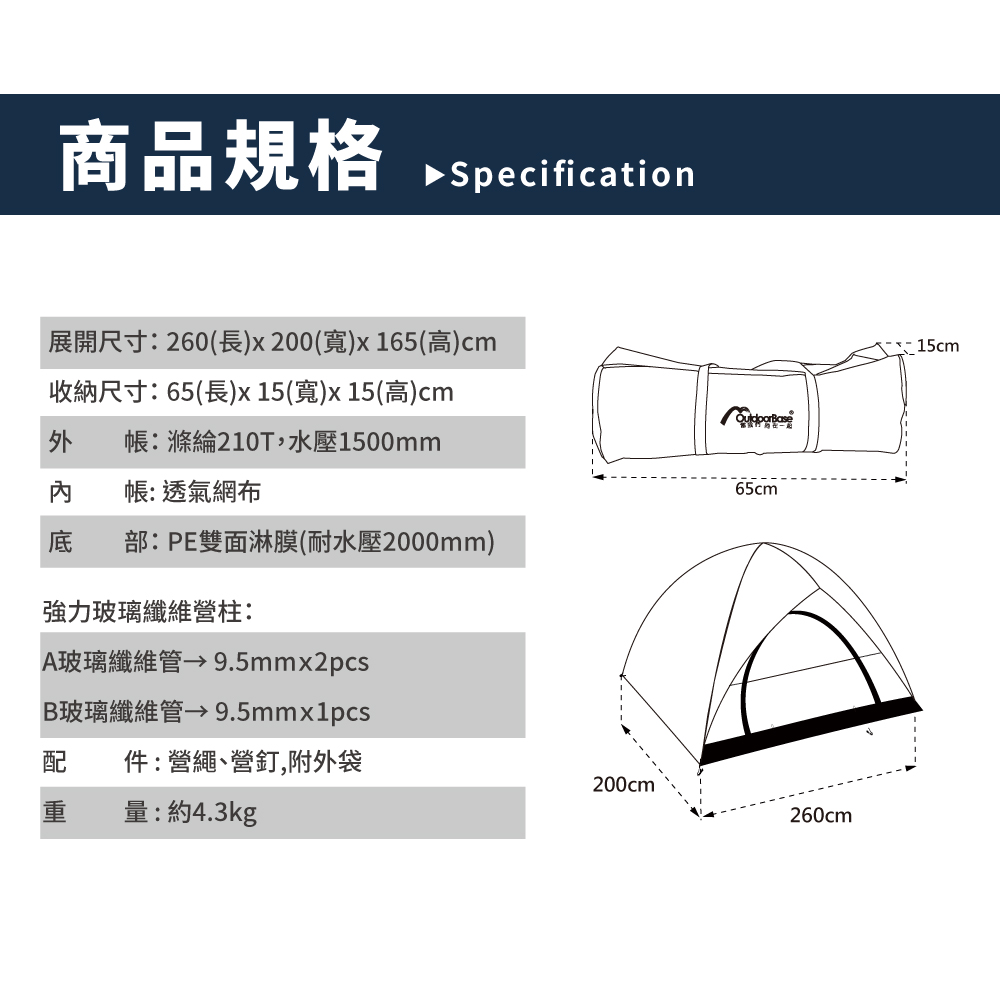 | 帳篷展開尺寸 | 260長x 200寬x 165高cm |