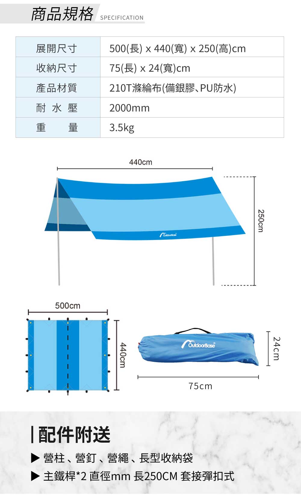 | 天幕附配件 | 營柱;營釘;營繩;收納袋;鋼管主桿2支 |